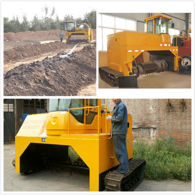 履帶式翻堆機行駛中整車騎跨在予先堆置的長條形肥基上,由機架下掛裝的旋轉刀軸對肥基原料實施翻拌、蓬松、移堆,車過之后篡成新的條形垛堆。在翻拋過程中,物料被高速旋轉的滾筒帶起并向后移動一定的距離所以在翻拋過程中,翻拋機可對物料打散、粉碎,并帶走部分水分。即可在開闊場地,也可在車間大棚中實施作業。該機一大技術突破在于整合了物料發酵后期的破碎功能,同時在翻拌的同時有氧氣會進入,可達到一天升溫、除臭、兩天滅菌(證機器的壽命,所以衷心提醒各位,在使用完翻堆機后要馬上的打掃里面的衛生,用水沖凈為止。