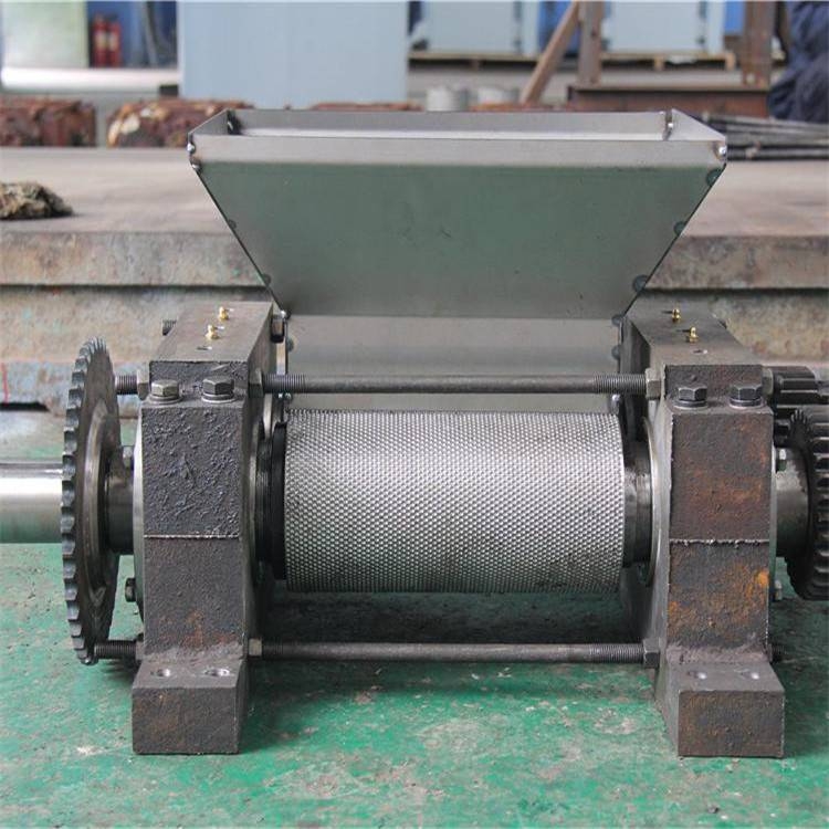 由電動機驅動皮帶和皮帶輪,通過減速機傳遞給主動軸,并通過對開式齒輪與被動軸同步,相向工作。物料從進料斗加入,經過輥擠壓成型,脫模造球,并經過一副鏈條,傳送到破碎篩工作室,篩下和分離成品顆(球)粒,然后返回料與新料混合,再進行造粒。隨著電動機連續轉動,物料的不斷進入,方能實現批量生產。